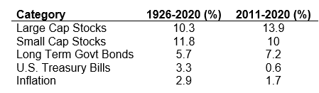If we accept the premise that some level of inflation will likely continue, the next step is to consider our options for mitigating its effects over time. The chart below outlines a few major classifications of investments tracking back to 1926 (when reliable data became available) as well as the most recent ten-year period. The SBBI data is provided by Ibbotson Research.